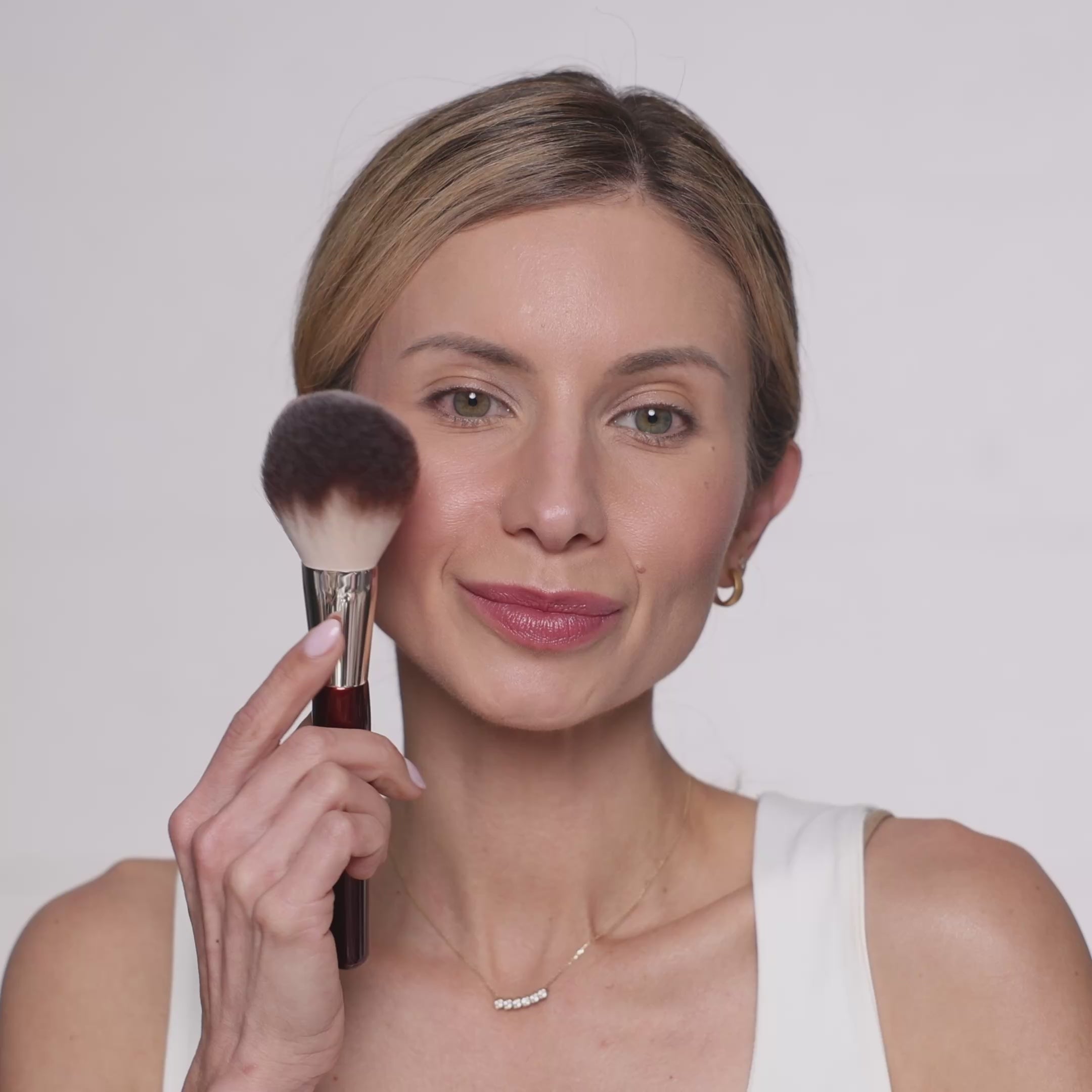Provides a sheer veil of powder application over the face with its fluffy, soft fibers. Applies loose or pressed powders with the most natural application.